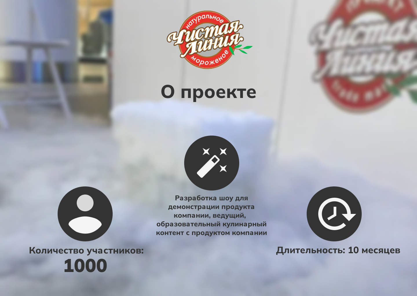 Проект длился с мая 2021 года по февраль 2022 года. Наша академия базировалась как в парках, так и в торговых центрах. Были задействованы различные специалисты: шеф повара, нутрициолог, химики, ведущие для мастер-классов. Так же, данный проект ездил в Сочи на проведение гонок Формула1 и покорил не только русскую, но и международную публику.
